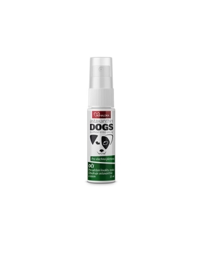Mix of antioxidants in spray for a great dog’s condition. Ingredients (in 1 dose, 120 mg): bio sunflower oil, Astaxanthin (Haematococcus pluvialis, oleoresin) 0,1 mg, coenzyme Q10 4 mg. Adjuvant: vitamin E (DL-alpha-tocopheryl acetate) – stabilizer.